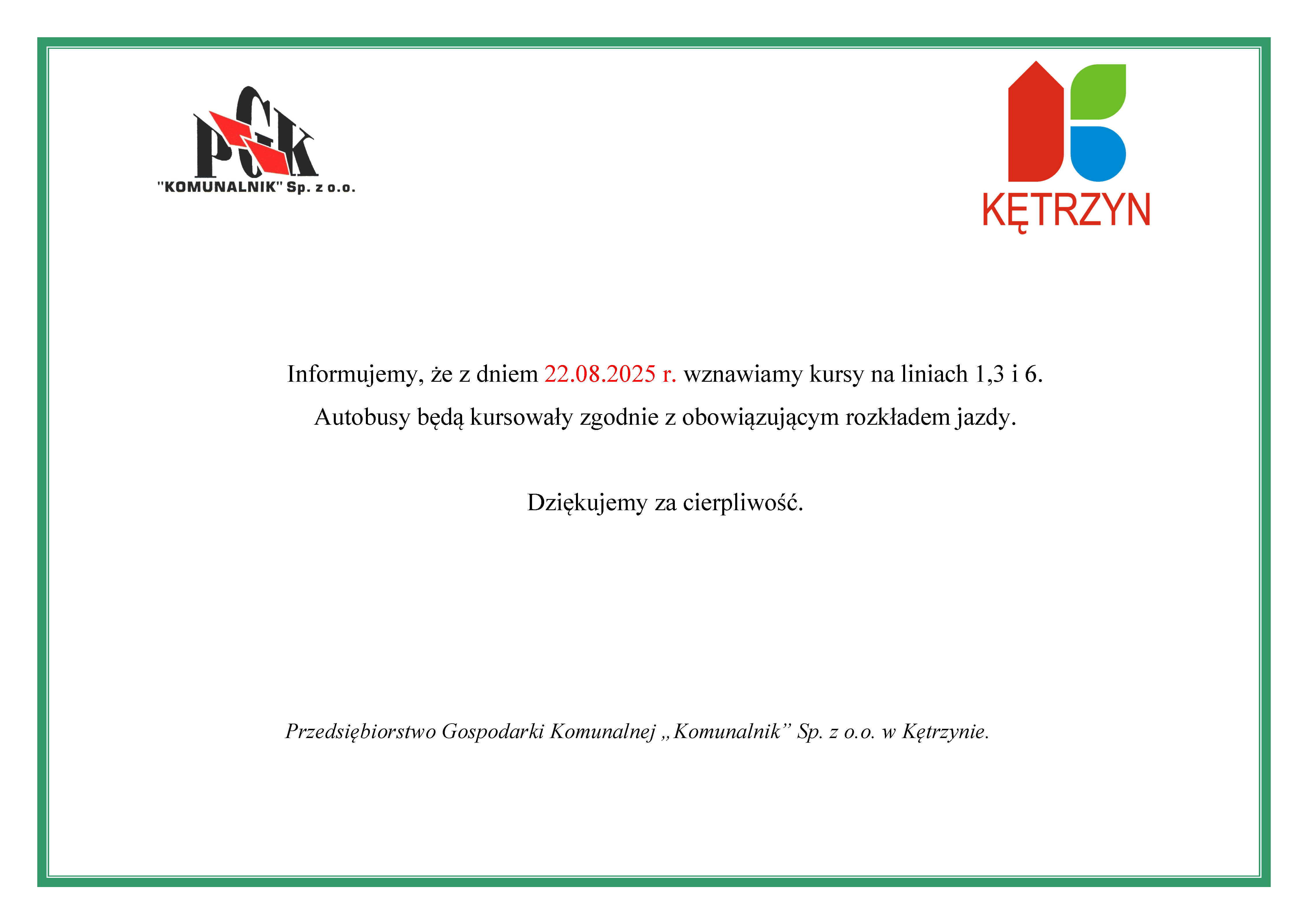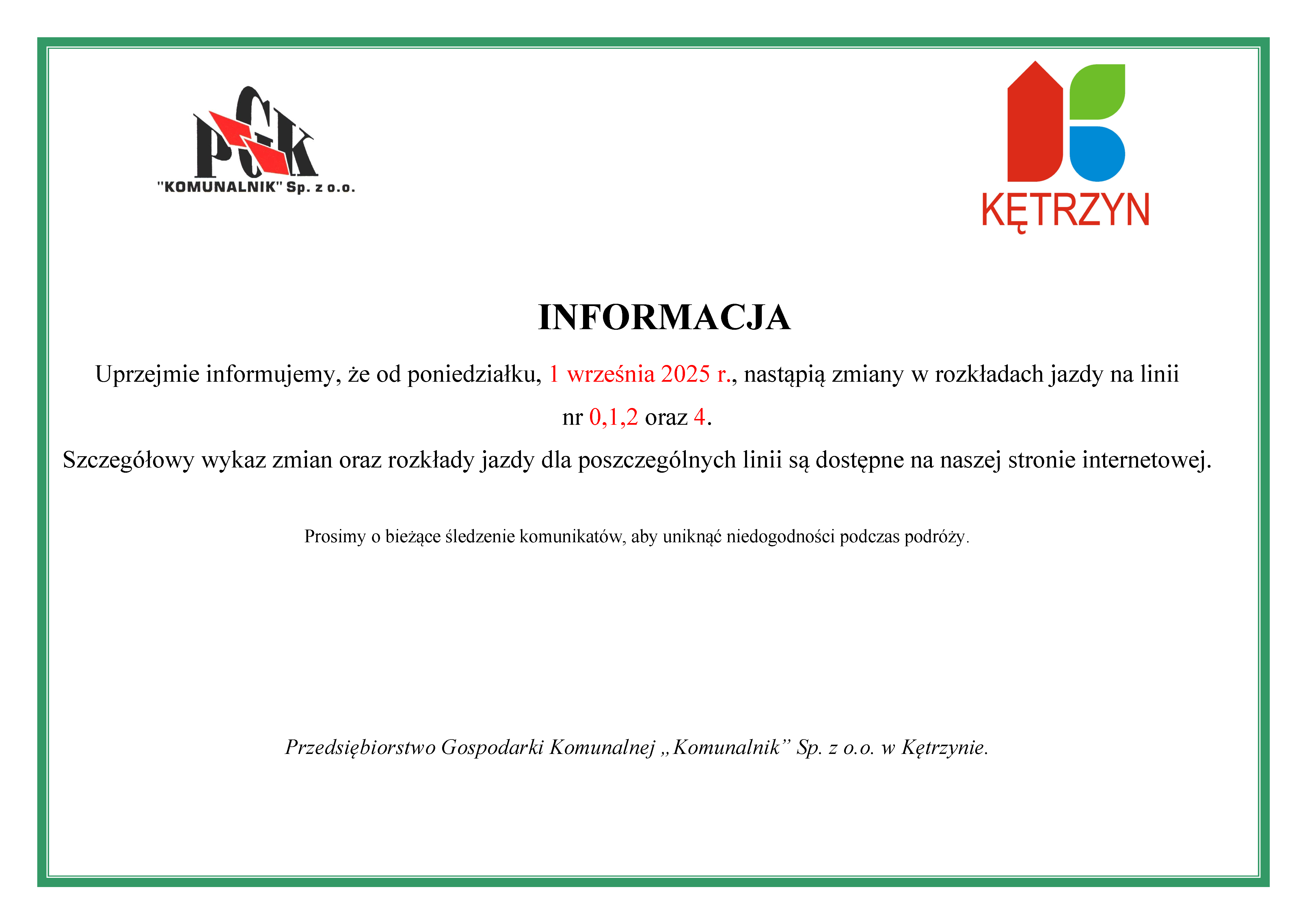 W związku z zakończeniem wakacji szkolnych od dnia 1 września 2025 roku zostaną wprowadzone korekty w wybranych kursach linii 0,1,2,4.